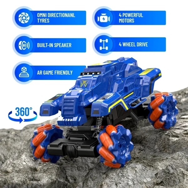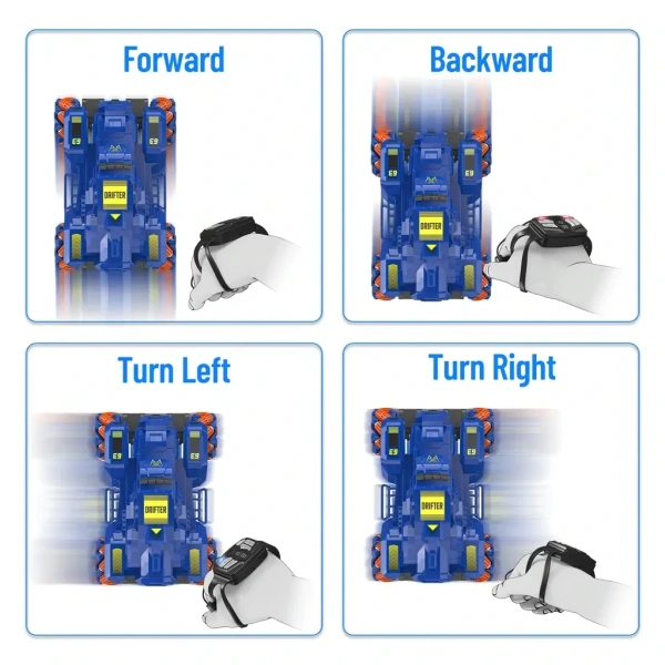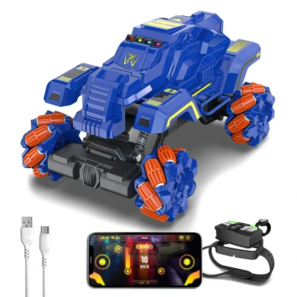 - Gesture Remote & App Control – Next-Level Driving Experience Control this RC car in multiple ways – use the gesture sensor watch, remote control, or mobile app to drift, race, and perform stunts. Experience seamless 360° rotation and multi-directional movement.