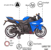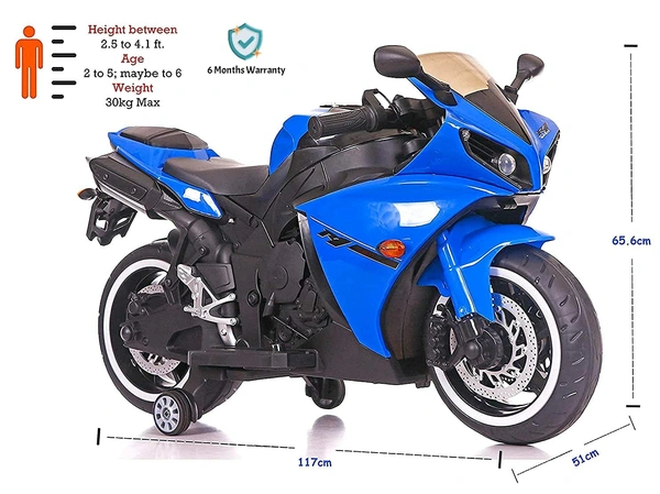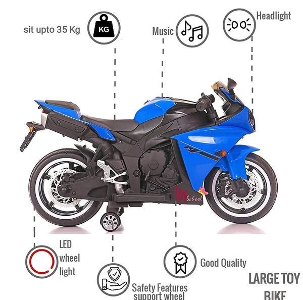 - Product details: Kids ride on bike operated with 550 single motor and Hand throttle acceleration with attractive features like LED headlights, attractive wheel lights, balance/support wheel, brake, push button start, digital looking display, forward/backward drive [reverse drive], bike speed 5 km/hr, smooth riding, music penal with USB card port, adjustable volume,Battery cell required horn etc.